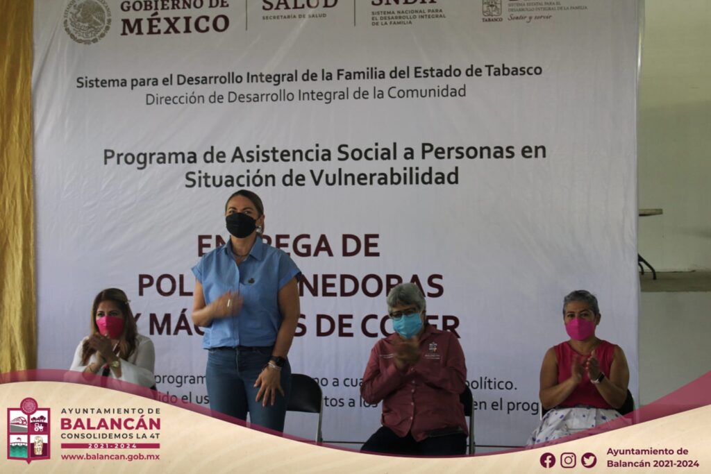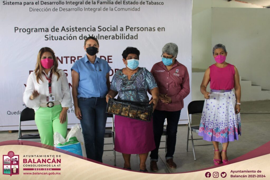 Acompaña la Presidenta Municipal de Balancán, Dra. Luisa del Carmen Cámara a la Lic. Guadalupe Castro de Merino, Presidenta del Sistema DIF Tabasco; quien el día del hoy realizó la entrega de paquetes de pollos, sacos de alimentos y máquinas de coser a ciudadanos beneficiados en la colonia la Cuchilla, acciones que se realizan a través del «Programa de Asistencia Social a Personas en Situación de Vulnerabilidad».