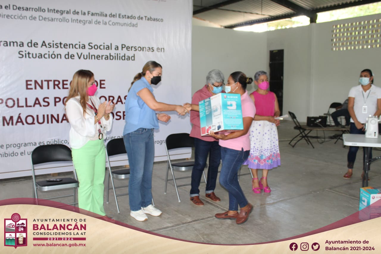 Entrega de paquetes de pollos, sacos de alimentos y máquinas de coser
